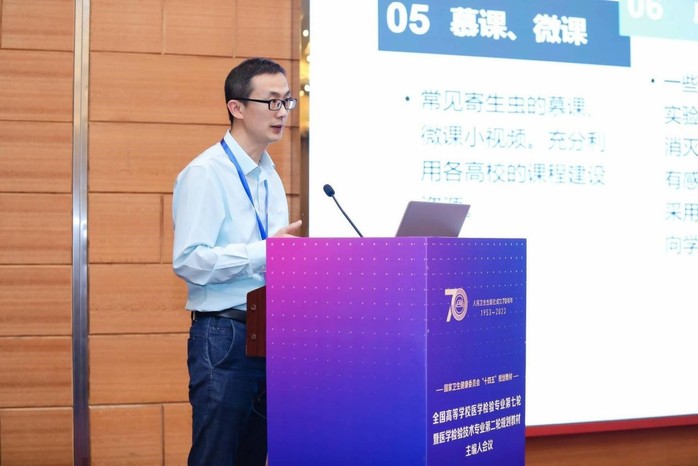 湛孝东教授以《临床寄生虫学检验技术》纸质版副主编及数字版主编身份,在大会上作数字教材编写思路的汇报,介绍了数字教材的总体编写思路与指导思想、编写特色、数字资源模块以及重要更新等内容。
